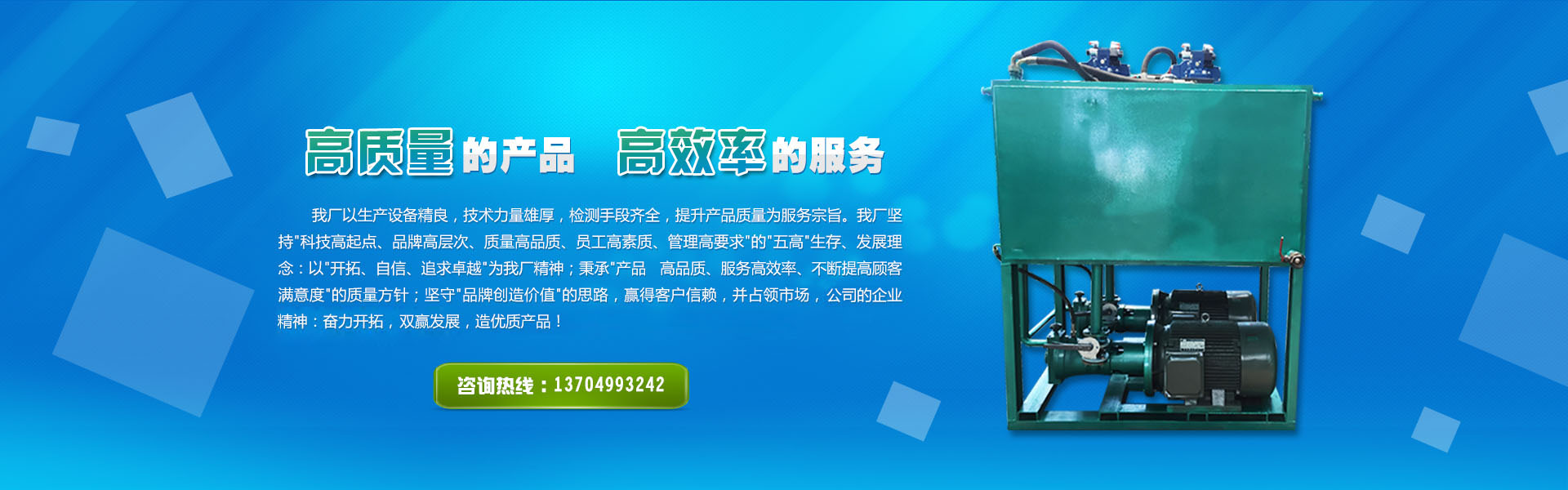我廠堅持科技高起點、品牌高層次、質量高品質、員工高素質、管理高要求的"五高"生存、發展理念,以"開拓、自信、追求卓越"為我廠精神。